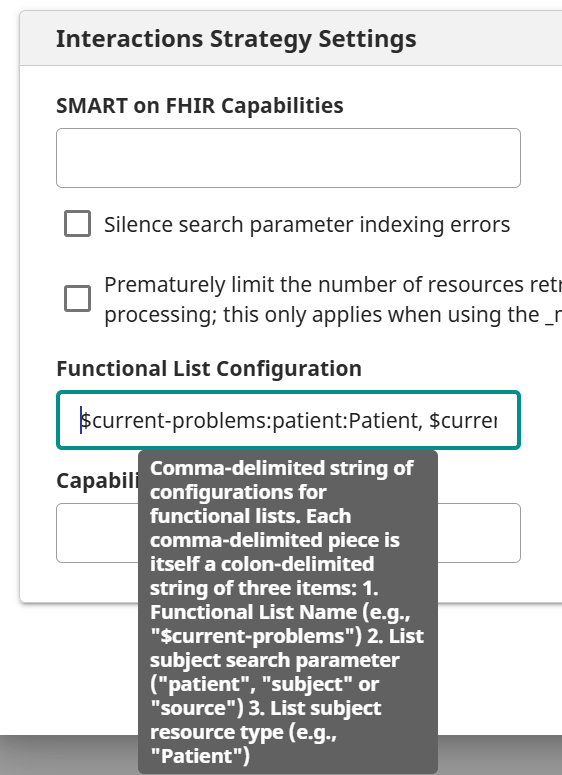 Note you can control the names of the functional list names (and for each list, it's subject Search Parameter, and subject Resource Type; for example in the sample above the subject Search parameter was patient and the subject Resource Type was Patient), via the FHIR Endpoint configuration, specifically the "Interactions Strategy Settings", see related Docs here. This looks like this: