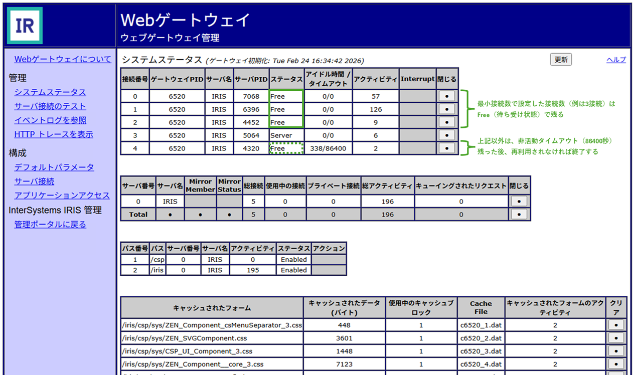 接続最小数 3の設定で、4以上の同時接続があった場合、Web処理完了後(レスポンスを返した後)、総接続中3つの ステータス=Free の接続(最小接続数)は、0/0(アイドル時間/タイムアウト、タイムアウトなし)で残りますが、それ以外の接続は 非活動タイムアウト まで残って、その後削除されます。