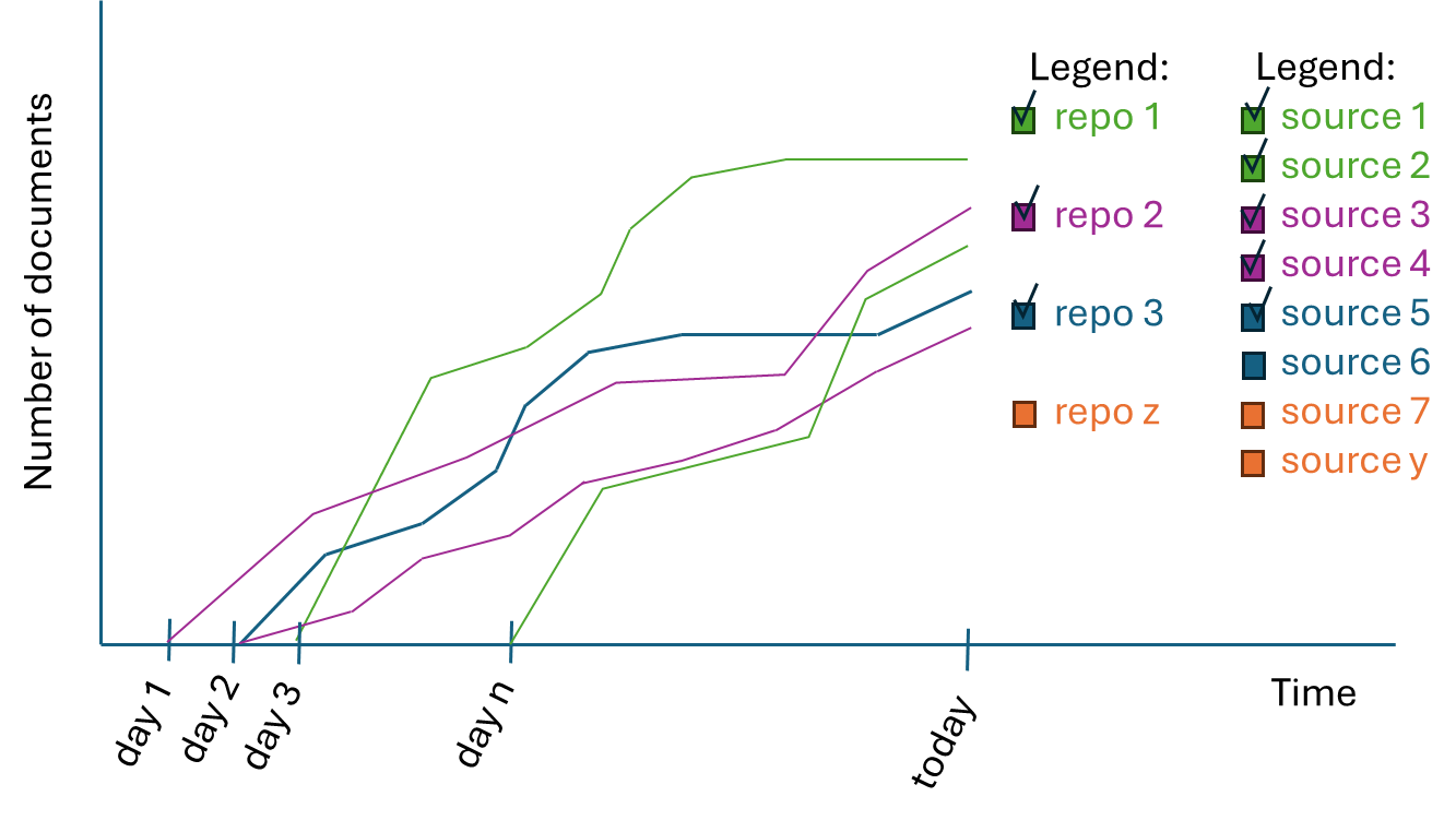1) a mock graph of the information we would obtain (cumulative curve of the document indexed up to each day per source/repo)