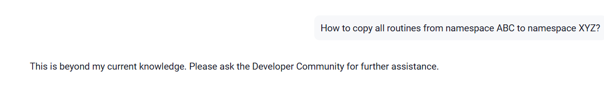 Is there any dedicated place on the InterSystems site to complain about "Ask AI" lack of rather simple knowledge? I'd say, as a bare minimum it should be trained on ALL InterSystems usually excellent documentation and know how to quote from it. A couple of recent examples, all of them "beyond my knowledge", which really should not be "beyond my knowledge". Common language rephrasing did help with a couple of requests below, but AI should be able to rephrase itself.