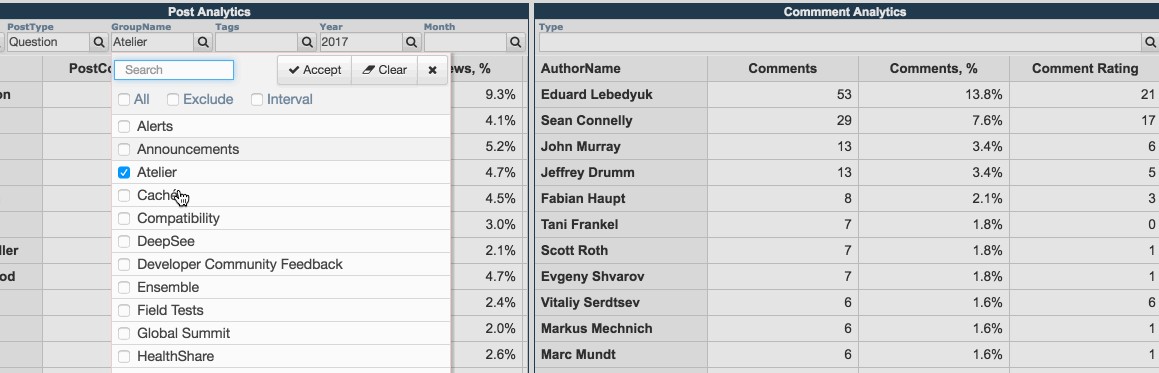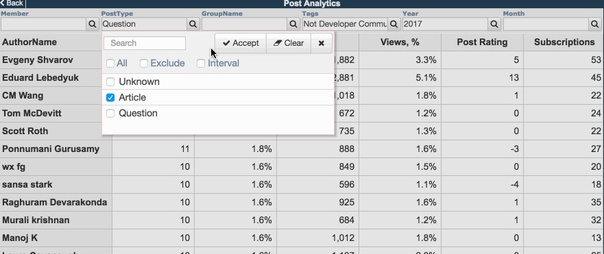 Or you can see what are the most interesting questions on Atelier in 2017. VPP Context shows views-per-post within the current filter and VPP Absolute shows views-per-post for this author for all the history.