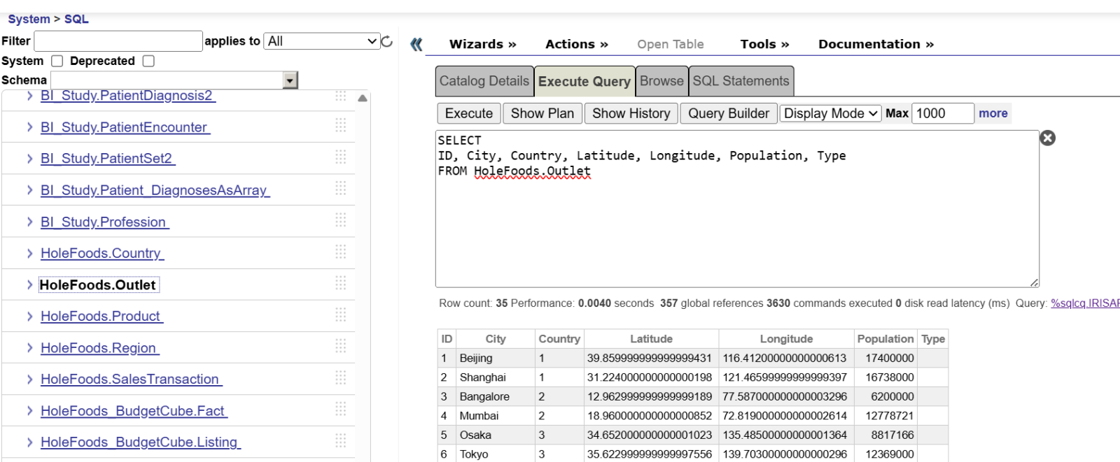 Let's try the table HoleFoods.Outlet by Executing the following SQL query in the Execute Query tab