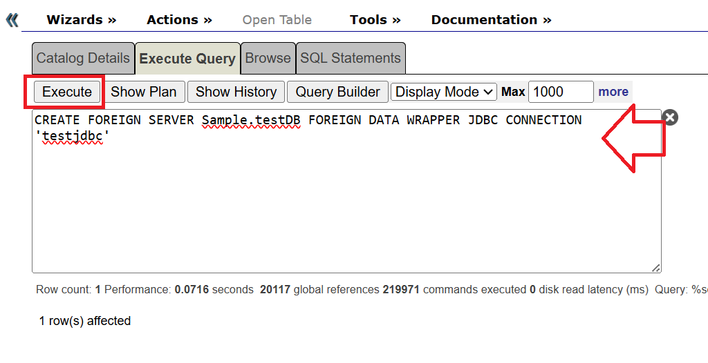 Now we are going to define a Foreign Server Sample.testDB by the following SQL. testjdbc is the name that we defined in the SQL Gateway JDBC connection in the pervious step.
