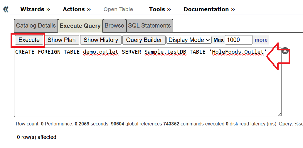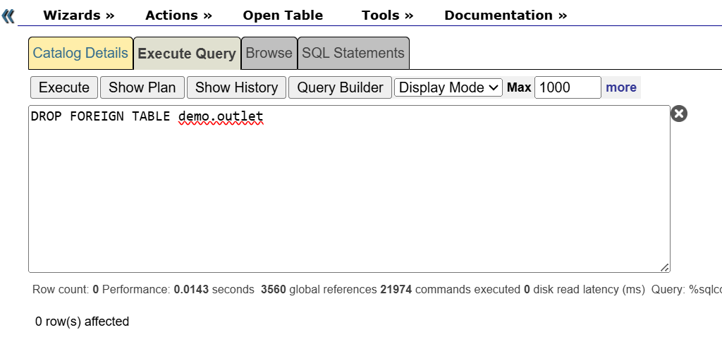 Now we are going to define a Foreign Table demo.outlet, which is pointing to the table HoleFoods.Outlet through the JDBC gateway