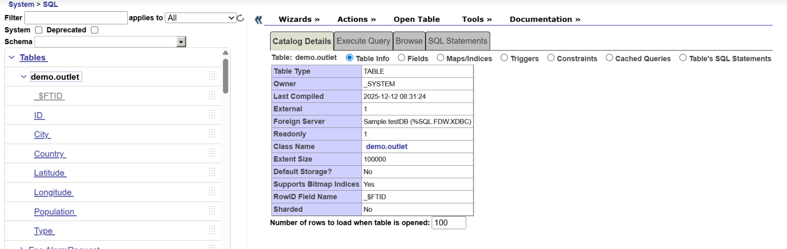 Here we would like to query this external table HoleFoods.Outlet by making use the feature of Foreign Table. (In InterSystems IRIS, different Namespace, can be config to point to different DB. In this example, Namespace IRISAPP and Namespace USER are pointing to different DB. As a result, we cannot query the table Namespace IRISAPP from Namespace USER directly. )