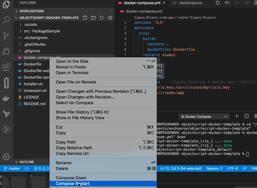 3. Right-click on docker-compose.yml->Restart - VSCode ObjectScript will automatically connect and be ready to edit/compile/debug