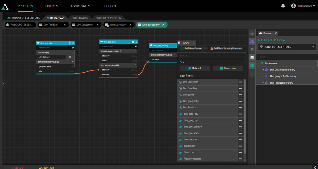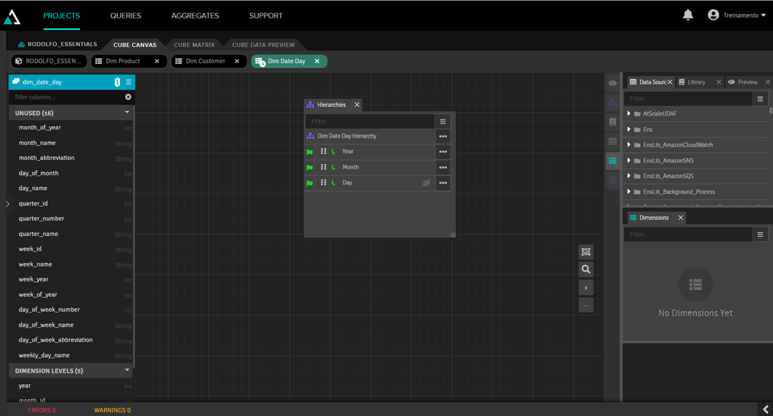 Another observation is that we added the calendar dimension, which is a table with fixed data for all calendar dates, detailing the day, day of the week, month, year, quarter, etc. In this dimension, we established a hierarchy of year, month, and day to create a drilldown for the user. To do this, we double-clicked the dimension to access the dimension editor, where we entered the year, month, and day in its hierarchy: