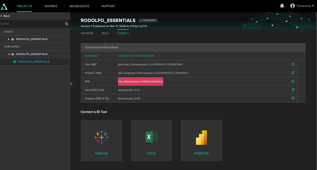 To view data from an external application (Power BI, Tableau, Excel), you first need to publish the cube. To do this, simply click Publish. After that, the connection strings will be displayed: