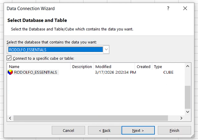 On the screen above, simply enter the connection string in the Server Name field and provide the AtScale username and password. Then select the cube: