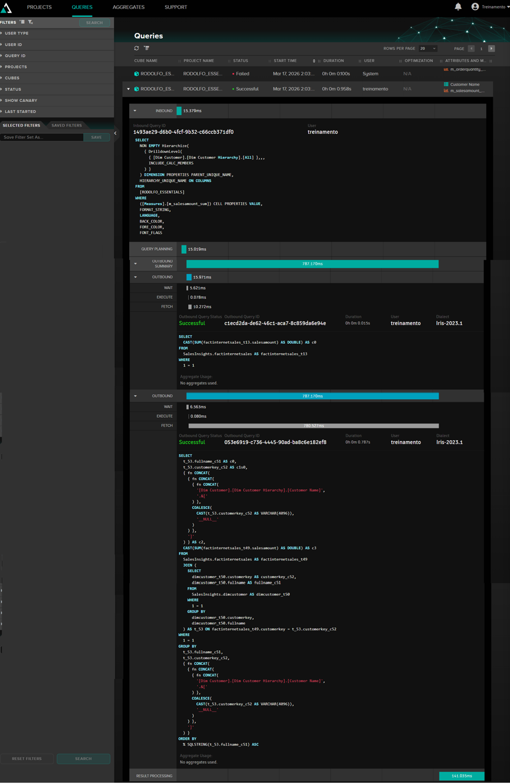 Here we can see the internal MDX query of AtScale and the query that is passed to Iris, as well as the execution time.