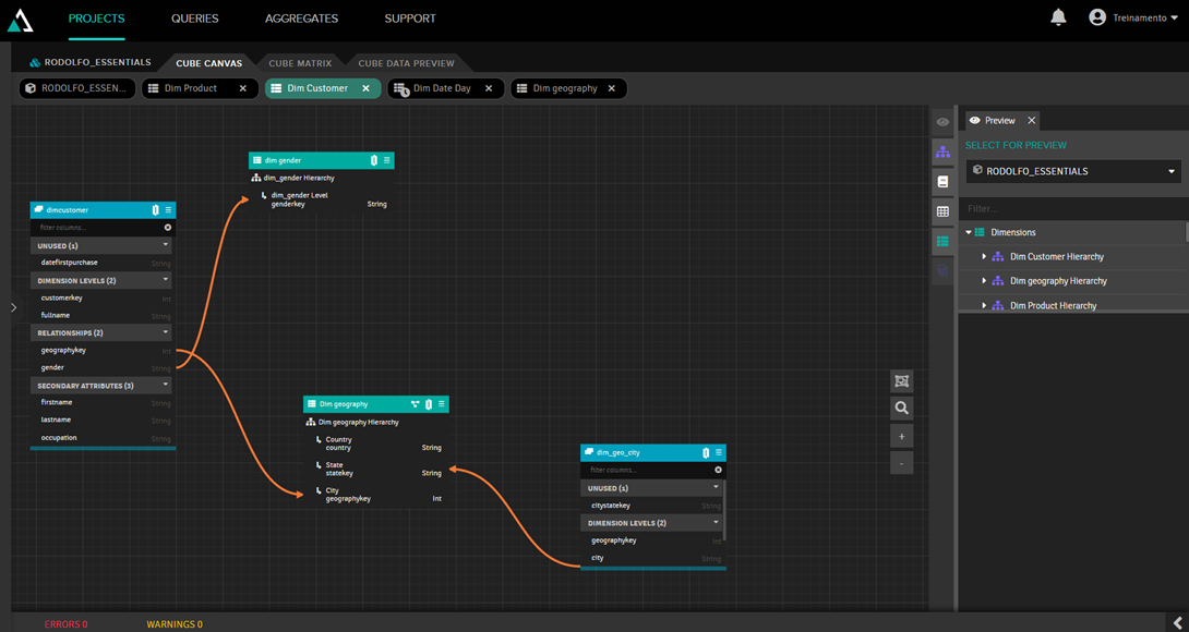 Snowflake refers to the ability to expand the model. In the example below, we enter the customer dimension and expand it by adding geographic information, through a table of cities, as well as gender information: