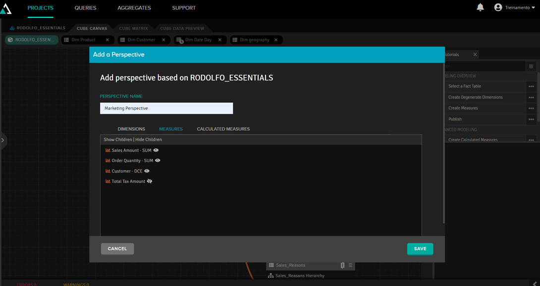 Perspectives serve to define the scope of a cube, in case there are users who cannot see all the data. In the example below, we created the marketing perspective. By clicking on the "eye," we define what they can and cannot see:
