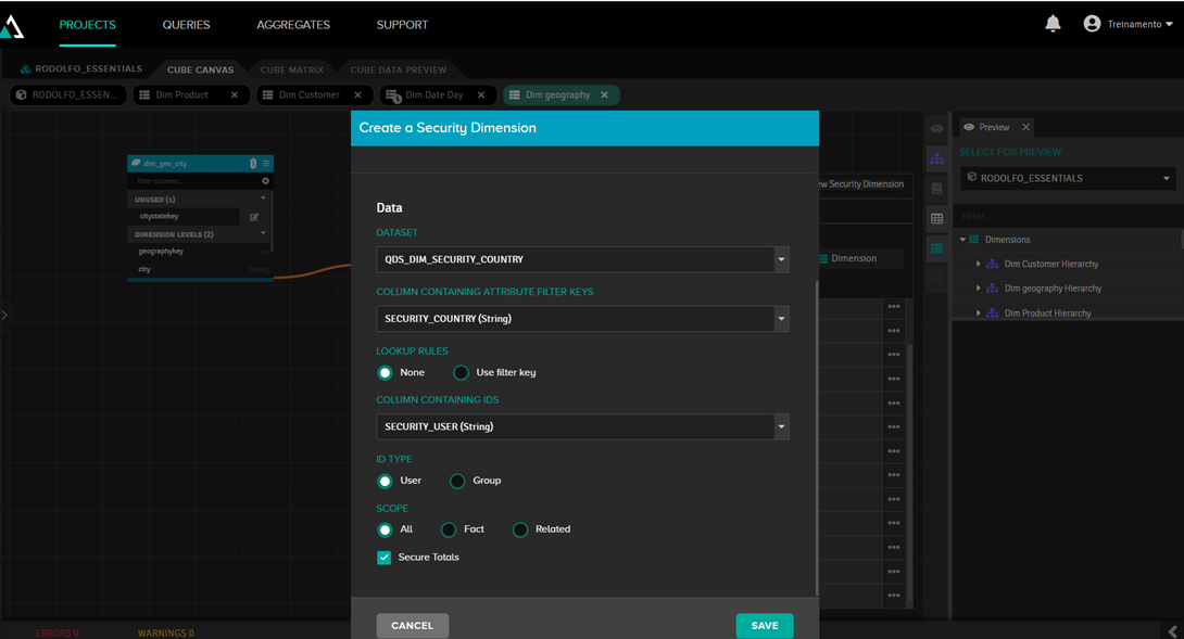 We will divide the security aspect into two topics: perspectives, which limit which columns a user can see, and security dimension, which limits which rows a user can see.