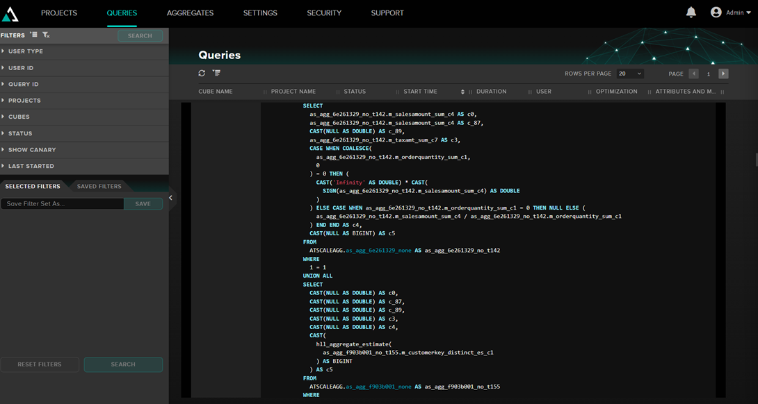 In the Queries section of AtScale, we see the queries that are being executed, both by external applications like Excel and by the AtScale preview. Example of a query: