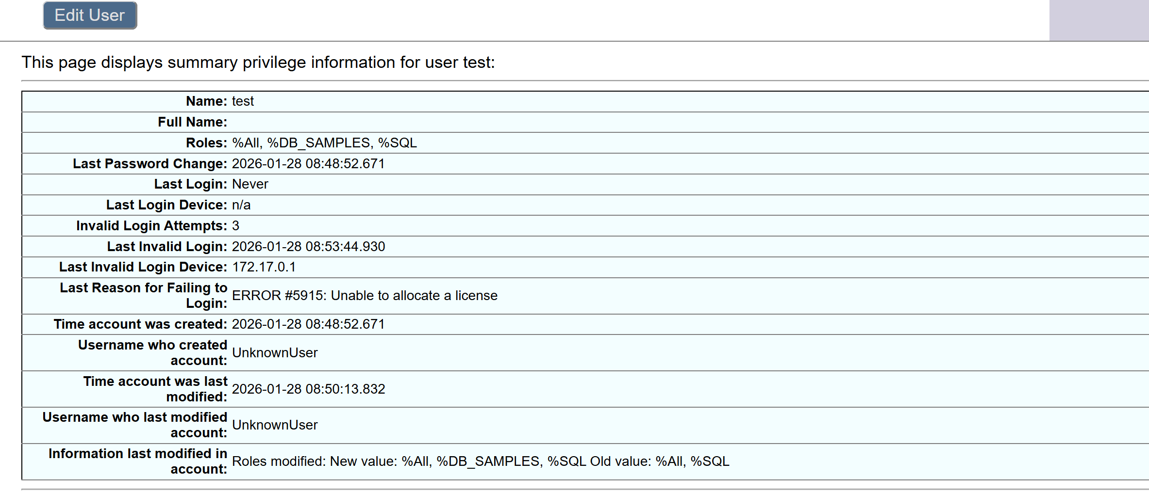 Does the test user account have the right security resources to access the database you're trying to log into? The quick easy way to check if you have a security-related issue is to give the test user the %All role and see if the issue goes away. If it does, you need to figure out what resource/role is missing for the user account. You don't want to permanently leave the %All role on there.