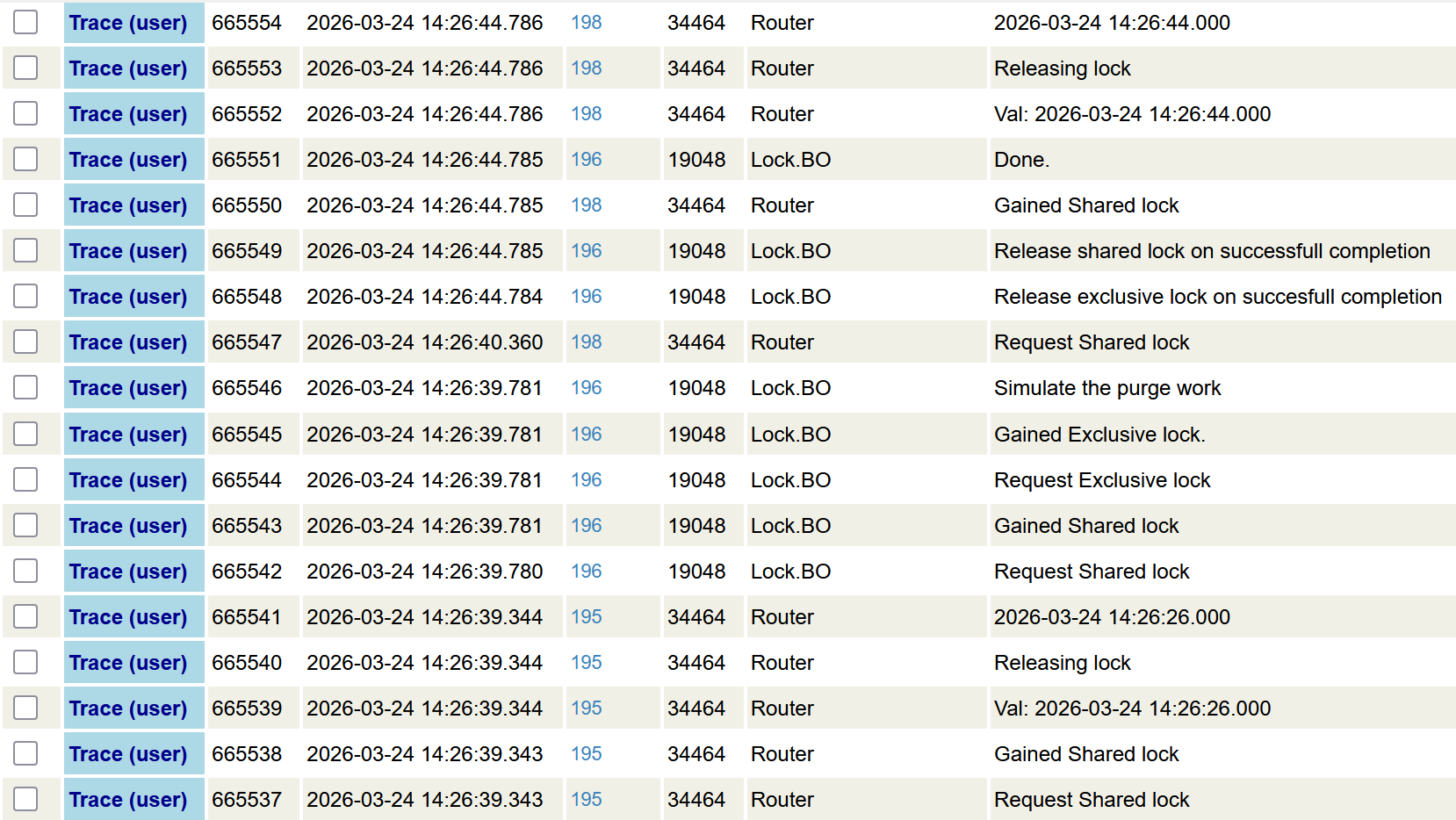 At 14:26:39.780 updater gets a shared lock and immediately upgrades it to an exclusive lock. At 14:26:40.360 a shared lock is requested by a custom function, however it's granted only 14:26:44.785, immediately after the exclusive lock is released by the updater Business Operation.