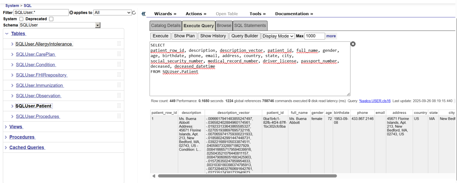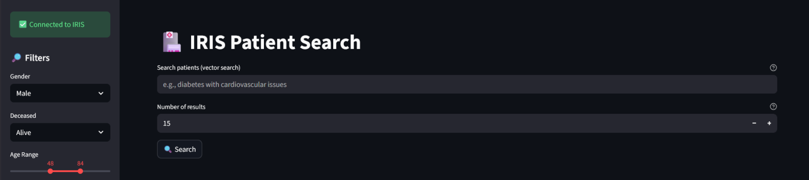 1. Import FHIR examples and extract structured data First step is connecting to the InterSystems IRIS containerized instance using IRIStool module. Next step is creating the FHIR table and importing synthetic FHIR bundles while generating embeddings. This step is the only performed by code, the following steps will be performed directly on the Streamlit UI.