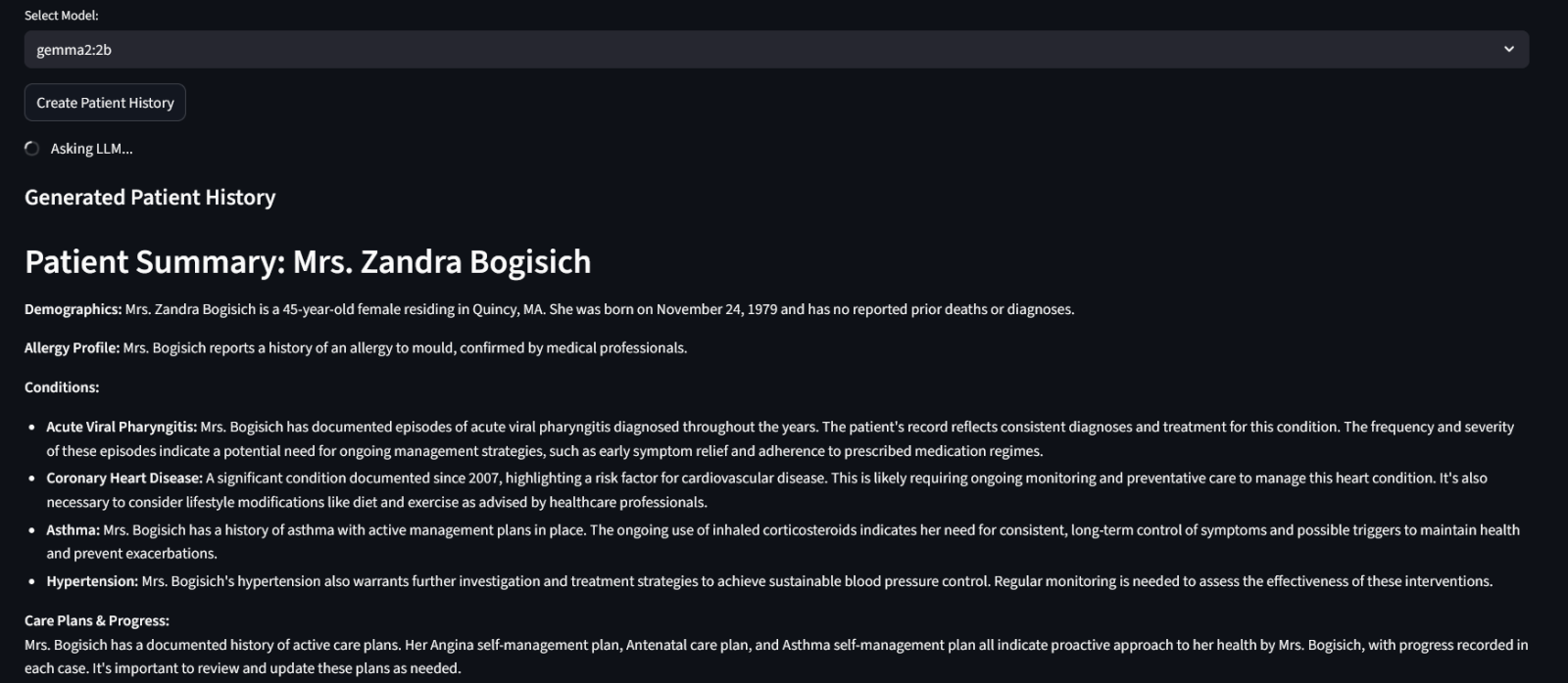 Generate comprehensive patient summaries using local LLMs such as: