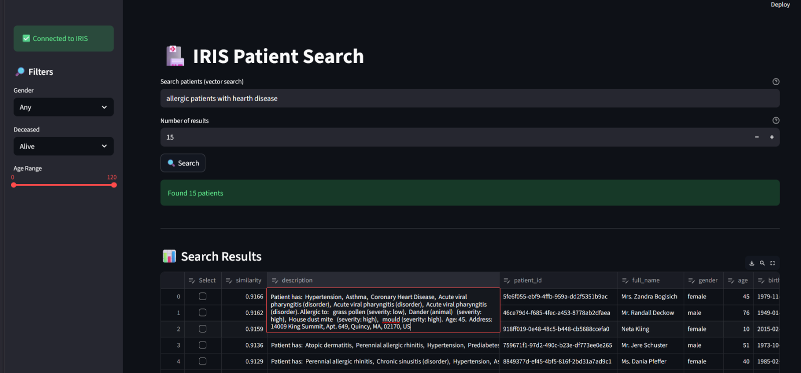 Use natural language queries and optional filters (gender, age, deceased status) to locate a patient.