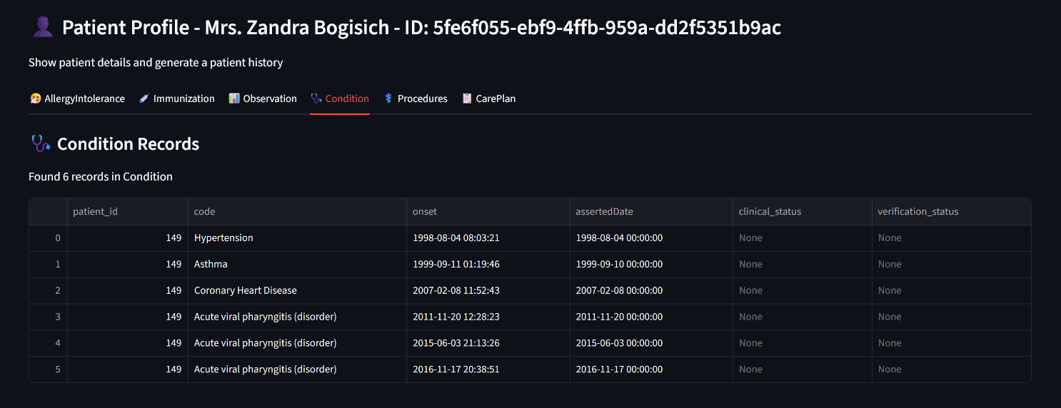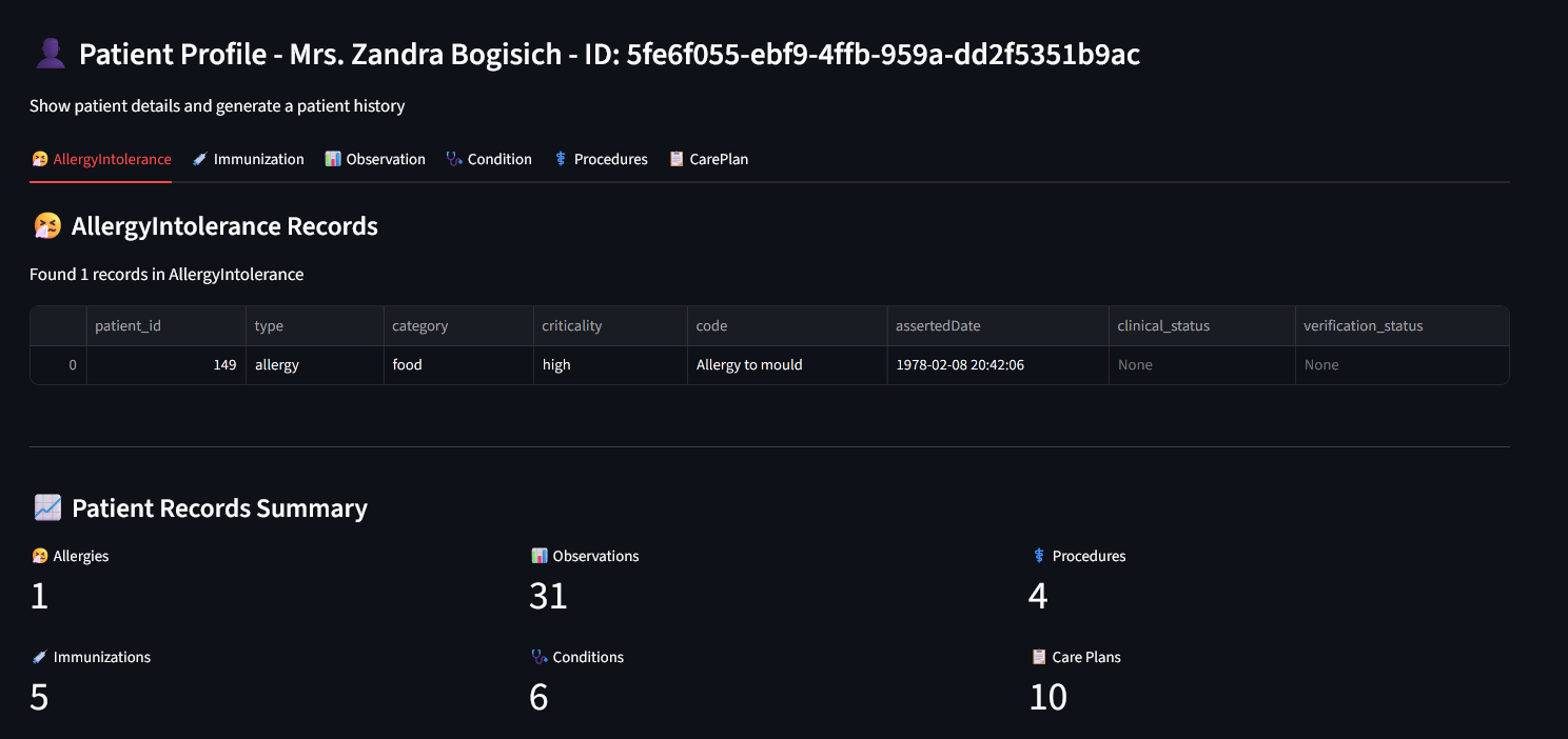 This allows clinicians or analysts to get an AI-generated overview directly from the structured FHIR records — with full data control and no external API dependencies.