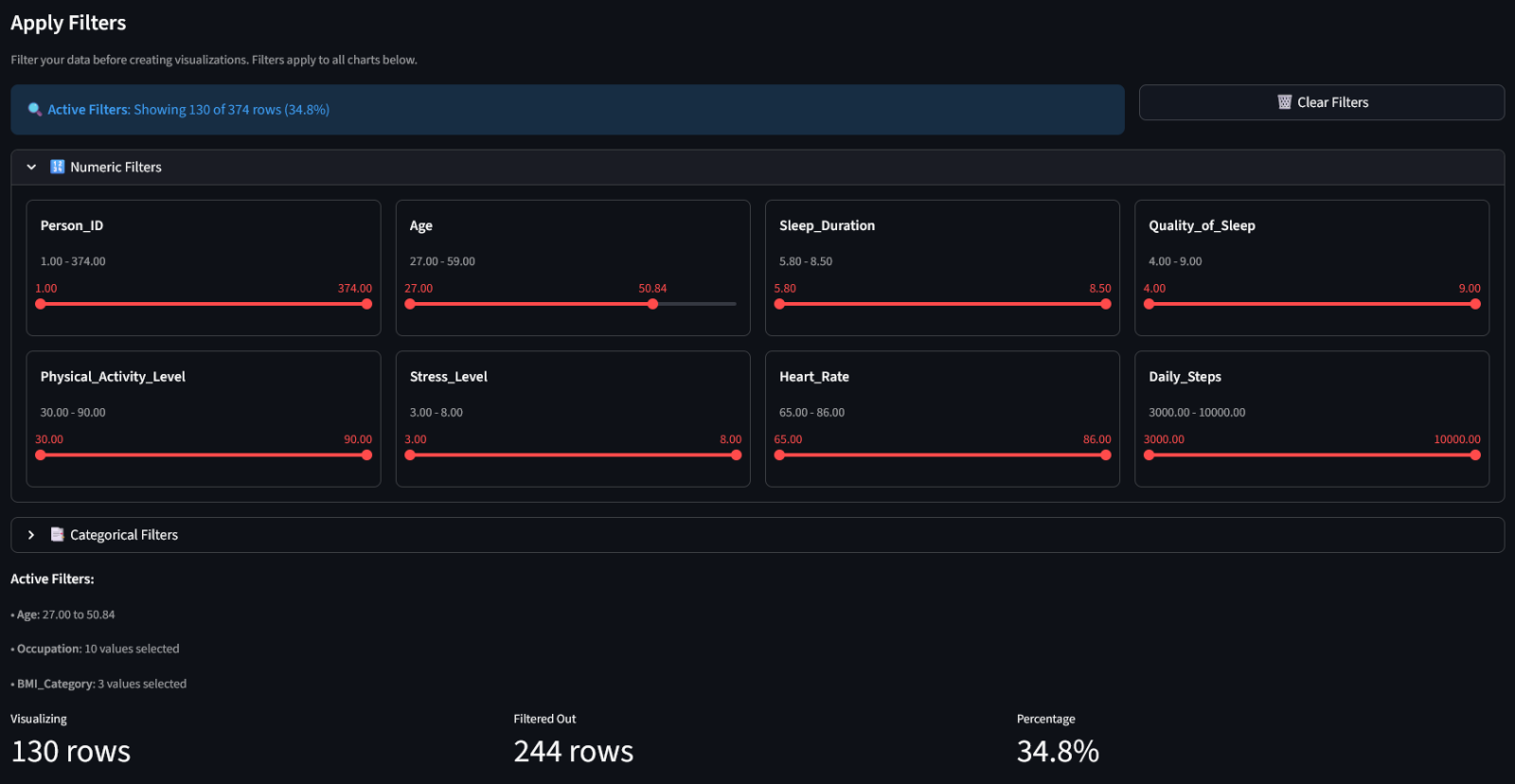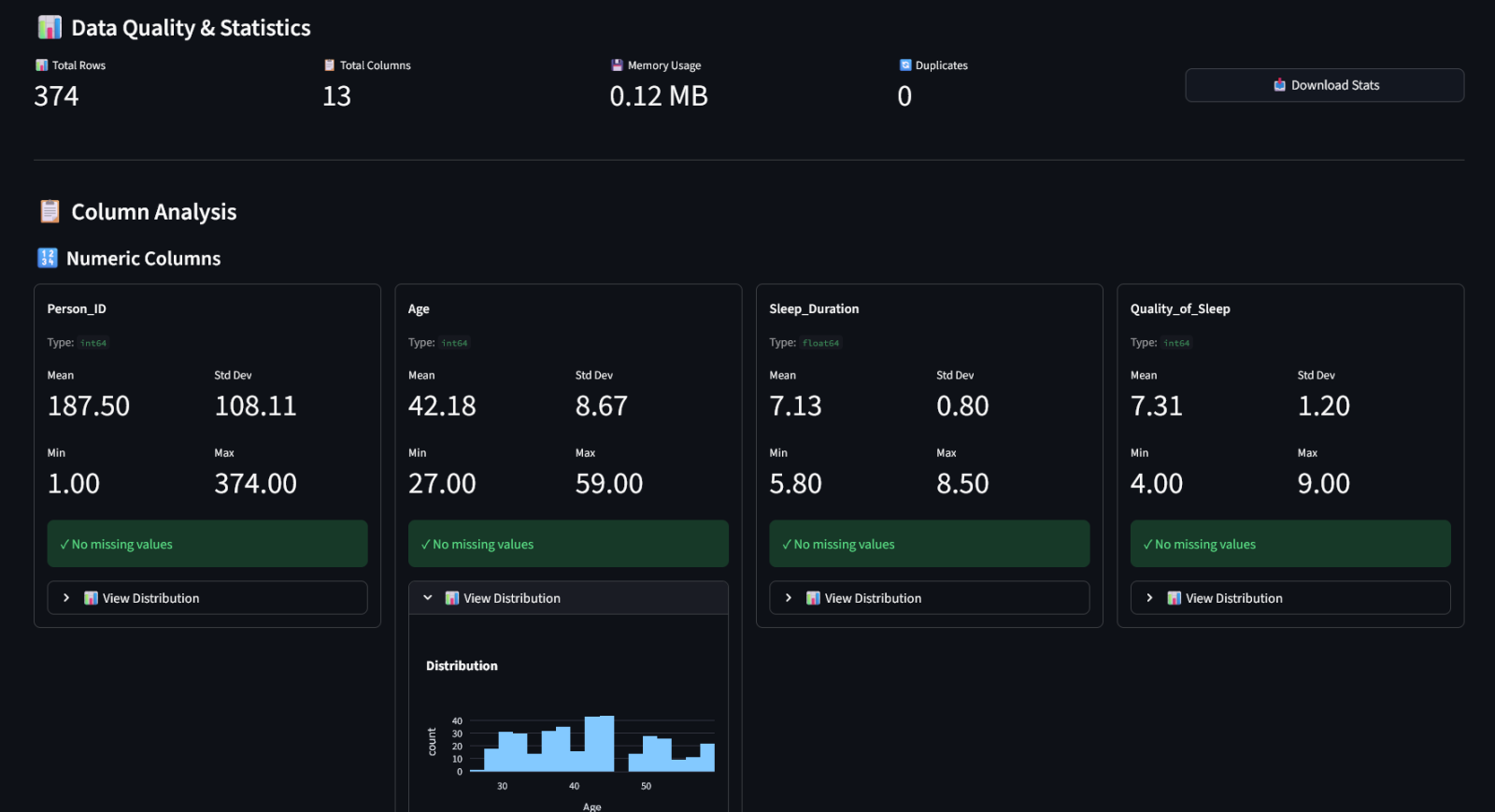 • View analytics of your data both for numerical and categorical columns