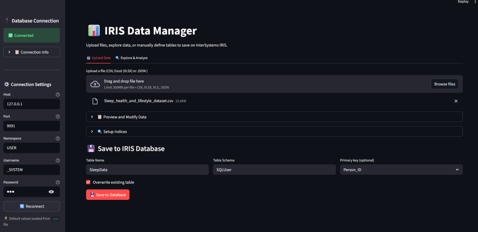 The IRIS Data Manager is a visual, no-code interface built with Streamlit, designed to make data management in IRIS accessible to everyone, from developers to analysts.