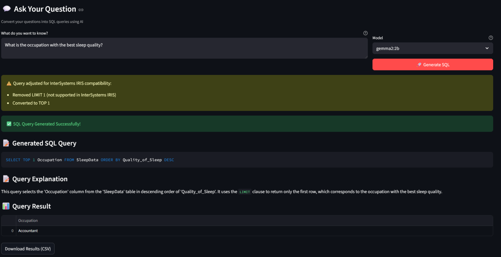 • The model (running locally via Ollama) translates it into SQL