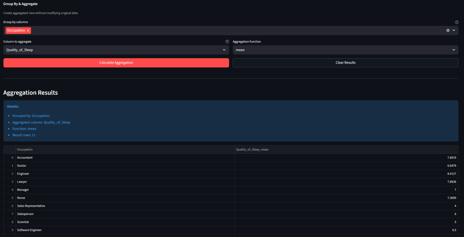 • “Show the average sleep duration grouped by occupation and gender”