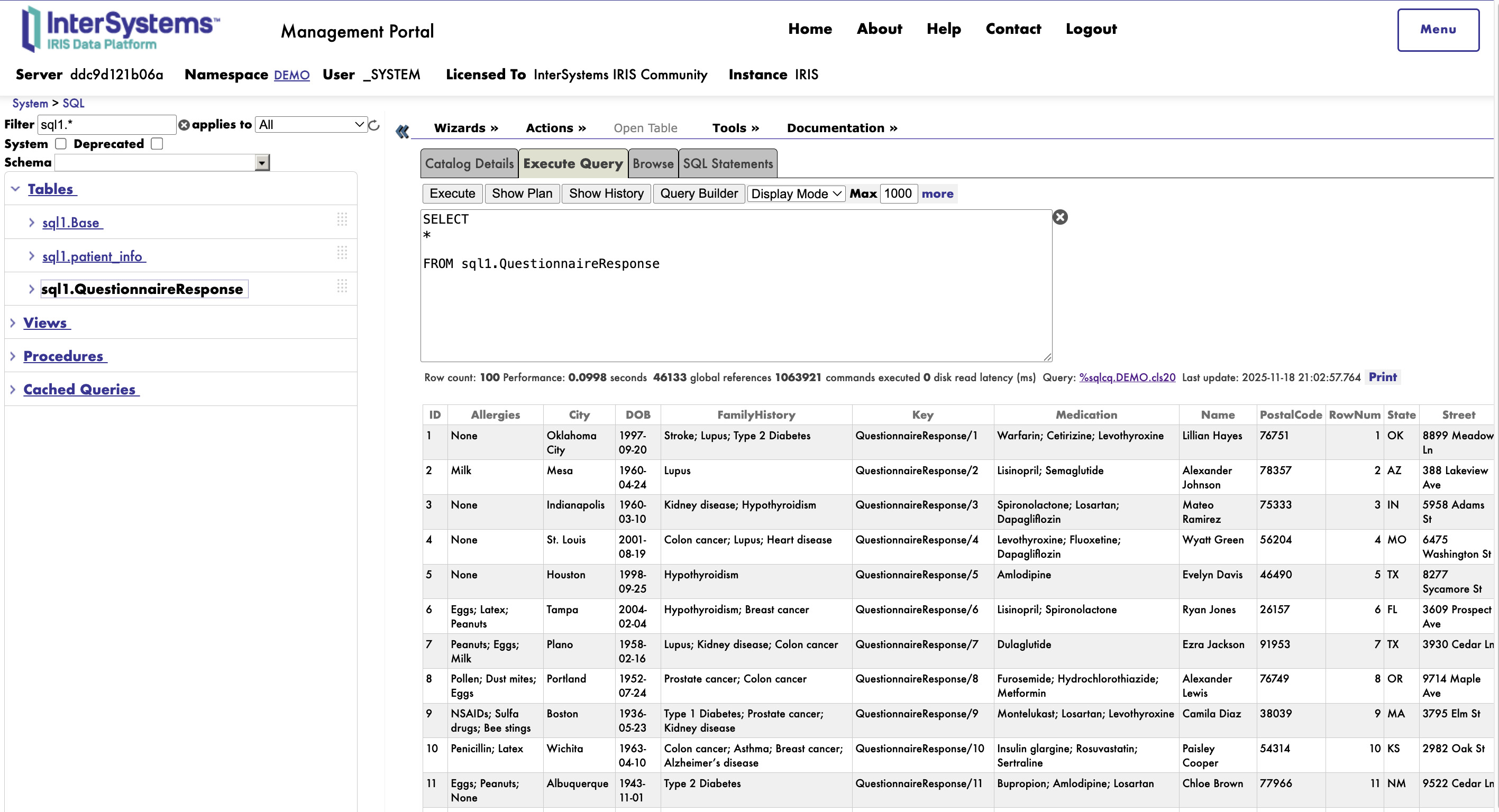 After loading FHIR QuestionnaireResponse resources into the server, use the InterSystems IRIS FHIR SQL Builder to automatically create relational SQL tables. This flattens the nested JSON structure, enabling easy analysis of questionnaire data with standard SQL—all configurable in just a few clicks.