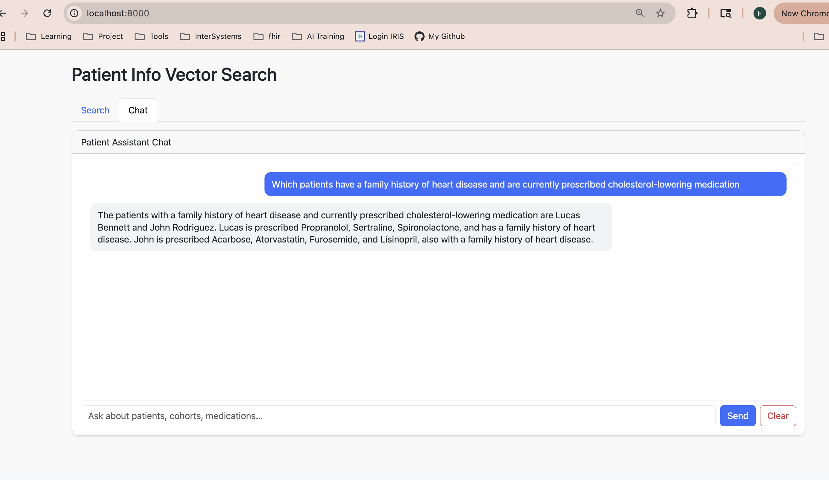 • When a user asks, “Which patients have a family history of heart disease and take cholesterol-lowering medication?”, the system semantically links related data—connecting cardiac conditions with drugs like propranolol, spironolactone, or atorvastatin—and produces a concise summary of at-risk patients.