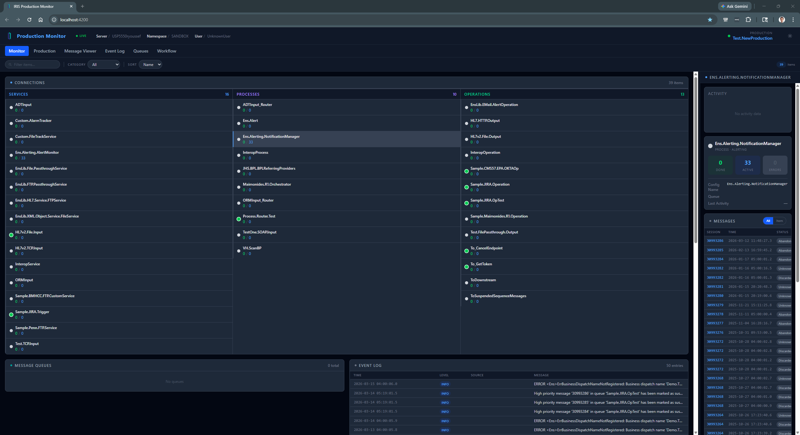 A standalone Angular web application that connects to any Interoperability-enabled IRIS namespace and gives you a live view of your production — services, processes, operations, queues, event log, and message traffic — all in one screen.