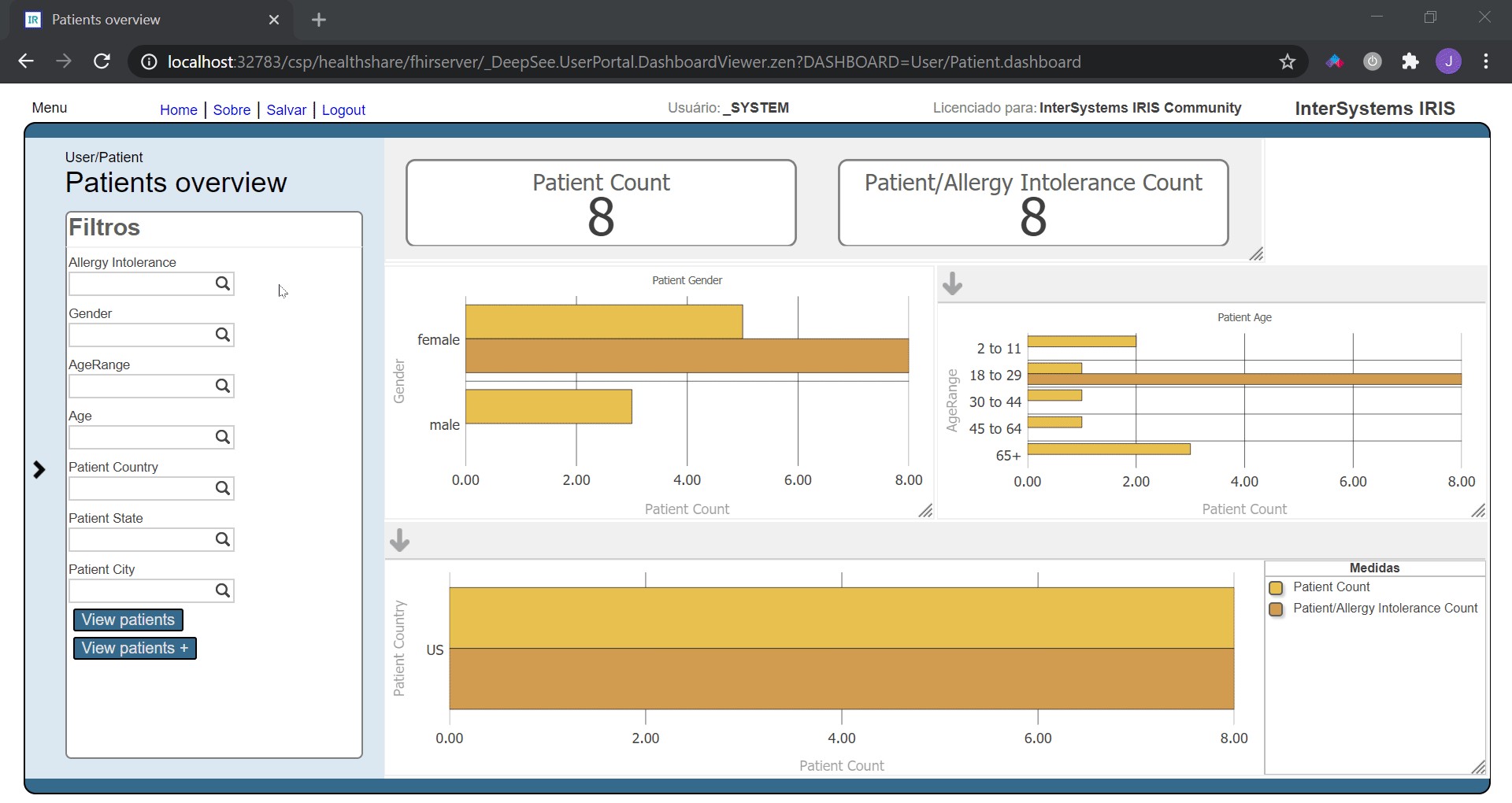 First, only resources of type Patient are returned, and each one of them are rendered with a button nearby. When this button is clicked, a $everything call is issued to server. Then, resources are grouped by type and rendered using a tab component.