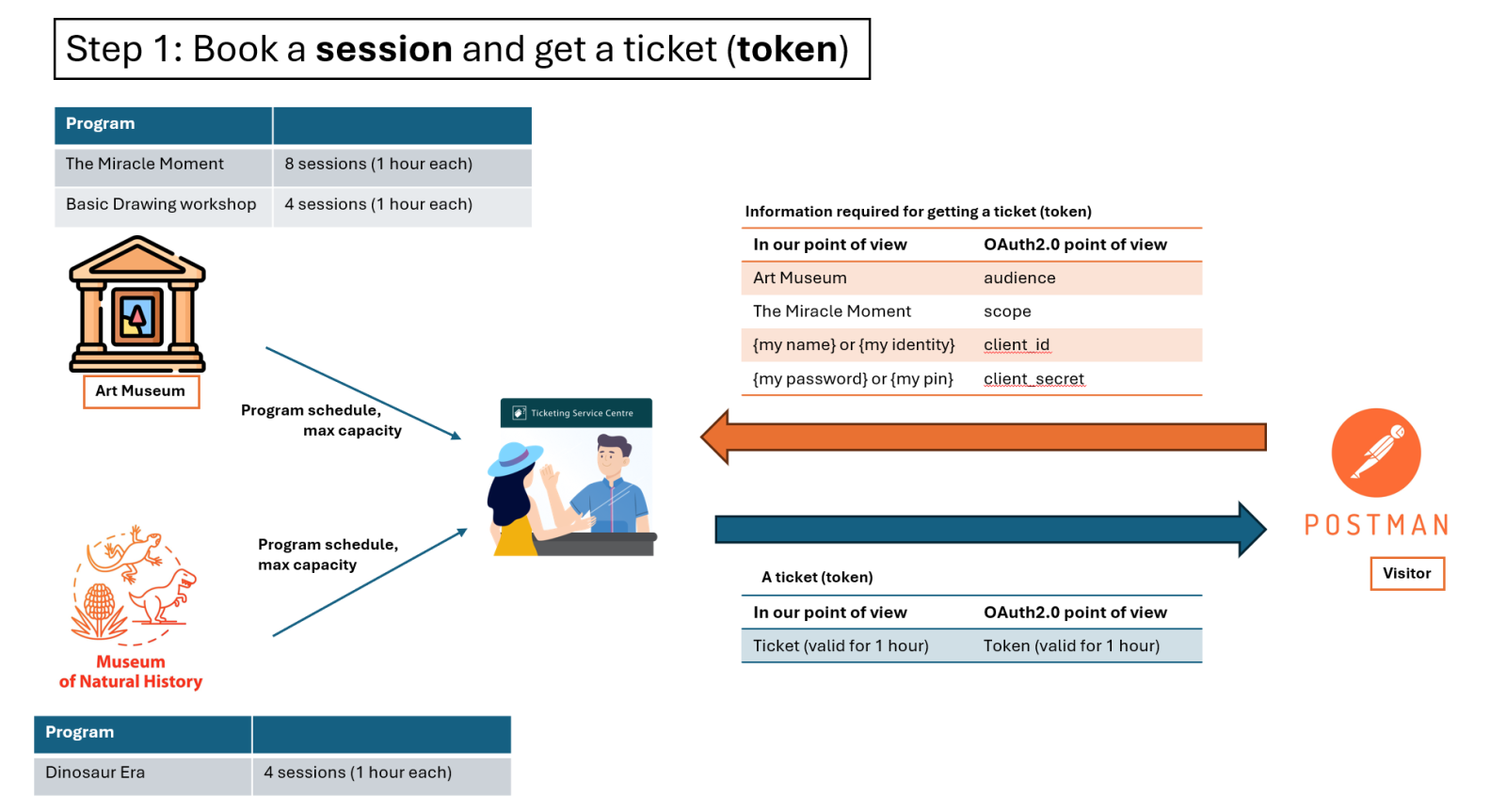 Let's consider the following scenario, you would like to visit an Art Museum for a special event "The Miracle Moment". As this event is so popular, the Art Museum decided to setup the flow control, divide the opening time into 8 sessions, for each session is 1 hour, and visitor must book their own session in the Ticketing Centre before visiting. In the other word, the visitor must present a valid ticket (token) at the correct time slot (session) to the Art Museum for the event "The Miracle Moment".