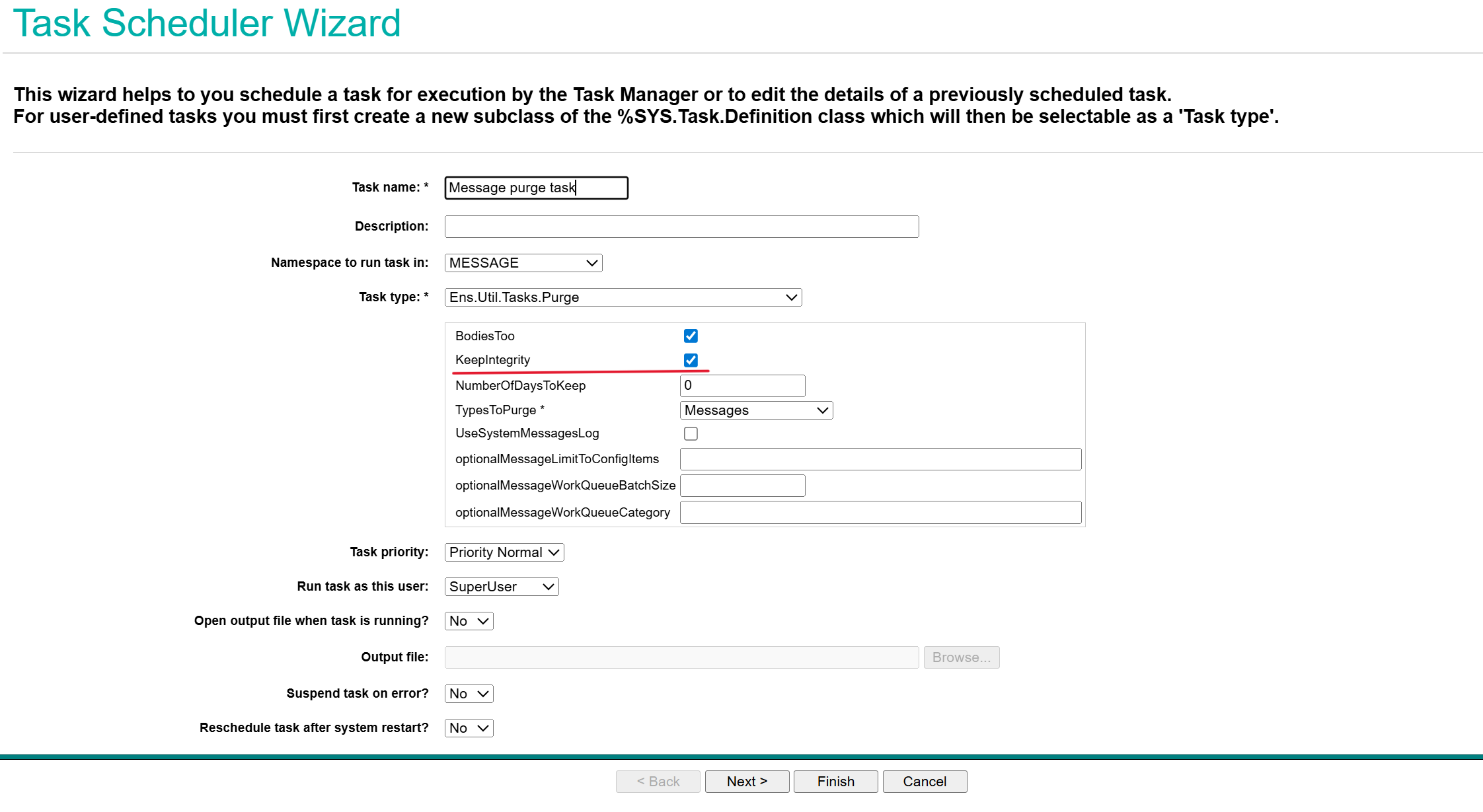 First, we want to check the purge task's settings. We want to confirm the NumberOfDaysToKeep setting and make sure that the task is set to purge messages in the namespace we are examining, but the setting we want to check the most is KeepIntegrity.
