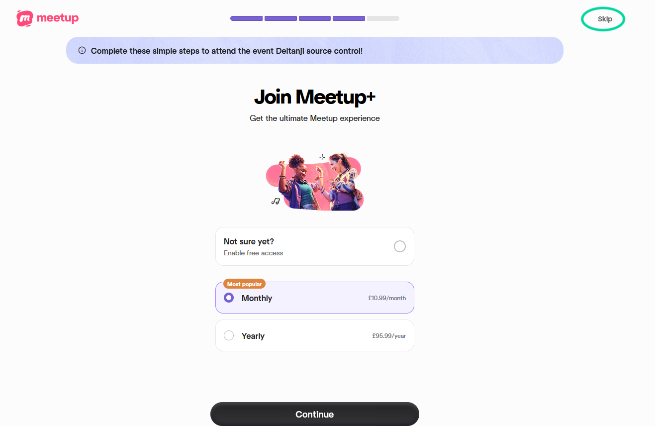If you would like to sign up, but don't already have an account with meetup, as part of the sign up process they ask you if you want to pay for meetup+. There's a well-hidden 'skip' button in the top right corner, so make sure you click that if you don't want to put in your card details :)